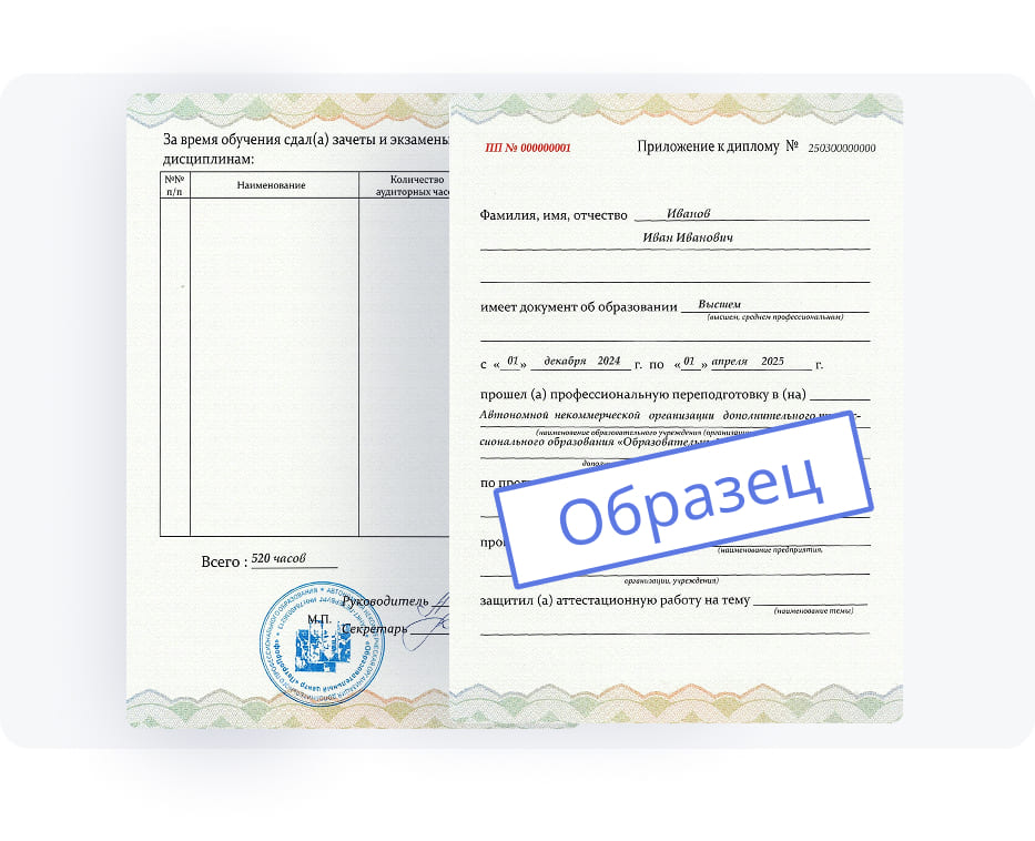 Диплом о дополнительном профессиональном образовании, полученный в нашем центре, признается работодателями и позволяет вам успешно трудоустроиться в компаниях различного уровня. Мы предлагаем гибкий график обучения, индивидуальный подход к каждому слушателю и доступ к современным учебным материалам. Если у вас есть вопросы, мы готовы дать подробную консультацию касательно процесса обучения.